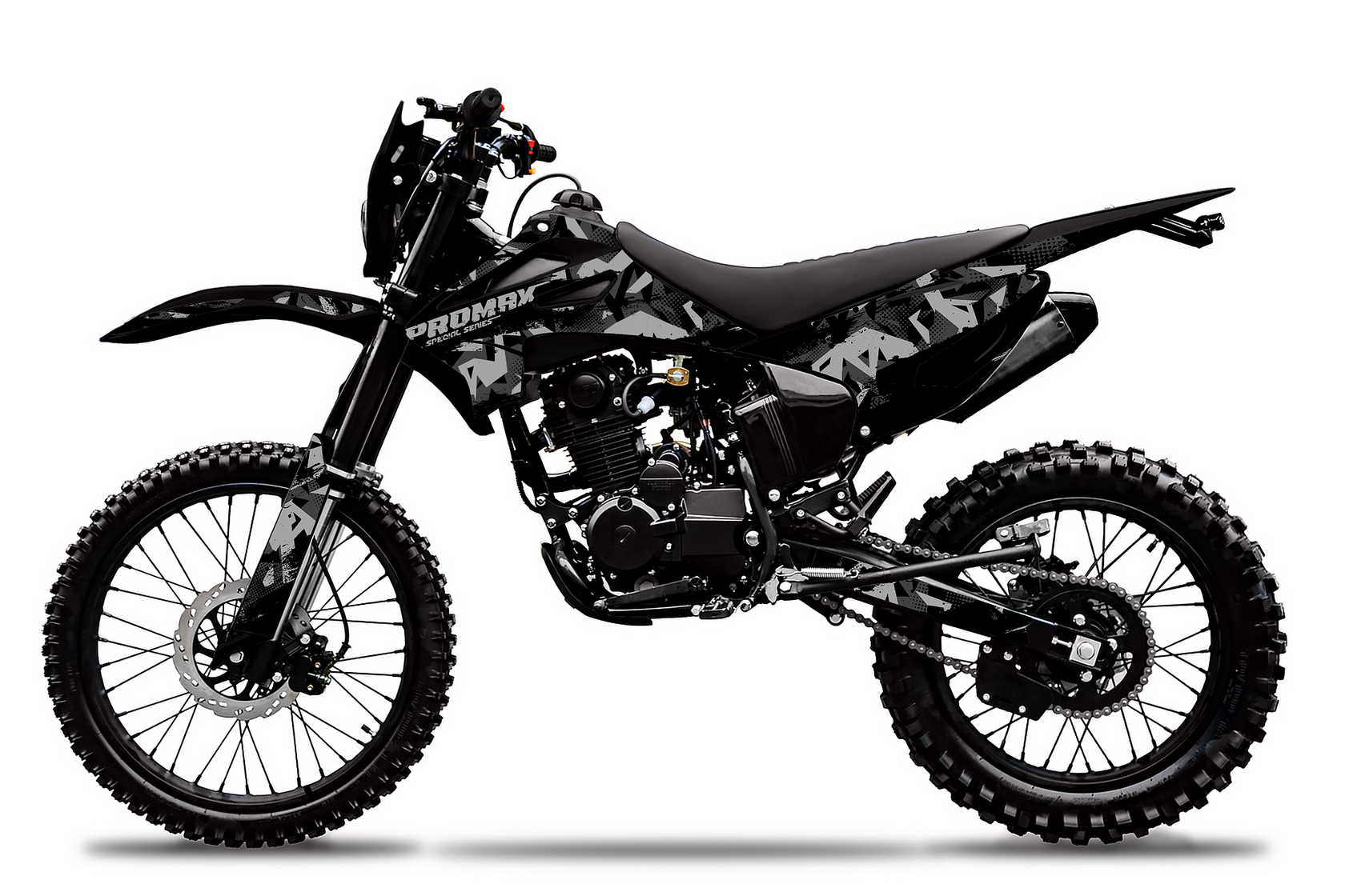 Мотоцикл PROMAX ARMY создан специально для выполнения сложных задач. Максимально облегченная конструкция выдерживает 2-х (двух) взрослых людей. Скрытный, черный дизайн. Тихая выхлопная система. Используется минимум электрики и дополнительных аксессуаров, основная цель НАДЕЖНОСТЬ!Для увеличения надежности и облегчения веса, в мотоцикле реализованы следующие технические решения:Хромомолибденовая рама с защитойРама изготовлена с упором на надежность и долгий срок службы. Все узлы тщательно проварены, есть дополнительные усиления. На раму установлен пластиковый каркас, который защищает мотоботы и раму. Алюминиевый маятник KTM для сбалансированного веса и большей прочности.Спортивные облегченные колеса 21/18Надежная тормозная система ANJIE (дочернее предприятие BREMBO)Двухпоршневой суппорт спереди и однопоршневой сзади от производителя тормозных систем ANJIE, в сочетании с колодками, изготовленными из керамического материала, обеспечивают высокий коэффициент трения и эффективность торможения даже при высоких температурах дисков. Сами же диски толщиной 4мм – гарантия безопасности и плавной остановки.Комфортное сидение PROMAXФирменное нескользящее сиденье PROMAX, выполненное по технологии anti-slip grip, держит любого райдера как суперклей: специальное ребристое водонепроницаемое покрытие позволяет чувствовать себя комфортно в любых погодных условиях.Галогеновое освещениеКороткоходная ручка газаРучка газа с коротким ходом от Nibbi Racing – пожалуй лучшее решение на подъемах и труднопроходимых участках. Нет нужды перехватывать ручку для получения большей мощности, достаточно подобрать необходимое усилие кисти и получить результат, оптимальный для стиля езды райдера!Приводная цепь ChohoЦепь Choho отличается от других большим запасом прочности, благодаря уплотнительному кольцу удерживающему смазку внутри и не пускающему пыль снаружи, предотвращая растяжение и низким уровнем шума – идеальное сочетание для тех, кто хочет как можно реже обслуживать технику и как можно больше эмоций получить!Фрезерованные траверсы CNC:Изготовленные из авиационного алюминия 7075, легкие и прочные траверсы выдерживают большие нагрузки. Система настройки положения руля "ближе-дальше" позволяет настроить удобное положение руля в стойке.ПодвескаПодвеска MNT, с диаметром пера в 41 мм, в заводской форме обладает широчайшими возможностями настройки, которых не представит ни один конкурент! При помощи внешних регуляторов и легко настраиваются прямо на трассе. Диапазон их настроек таков, что можно с утра посетить жестокую кроссовую трассу, а вечером лайтово прокатиться на природе - и иметь полный комфорт в обеих поездках.