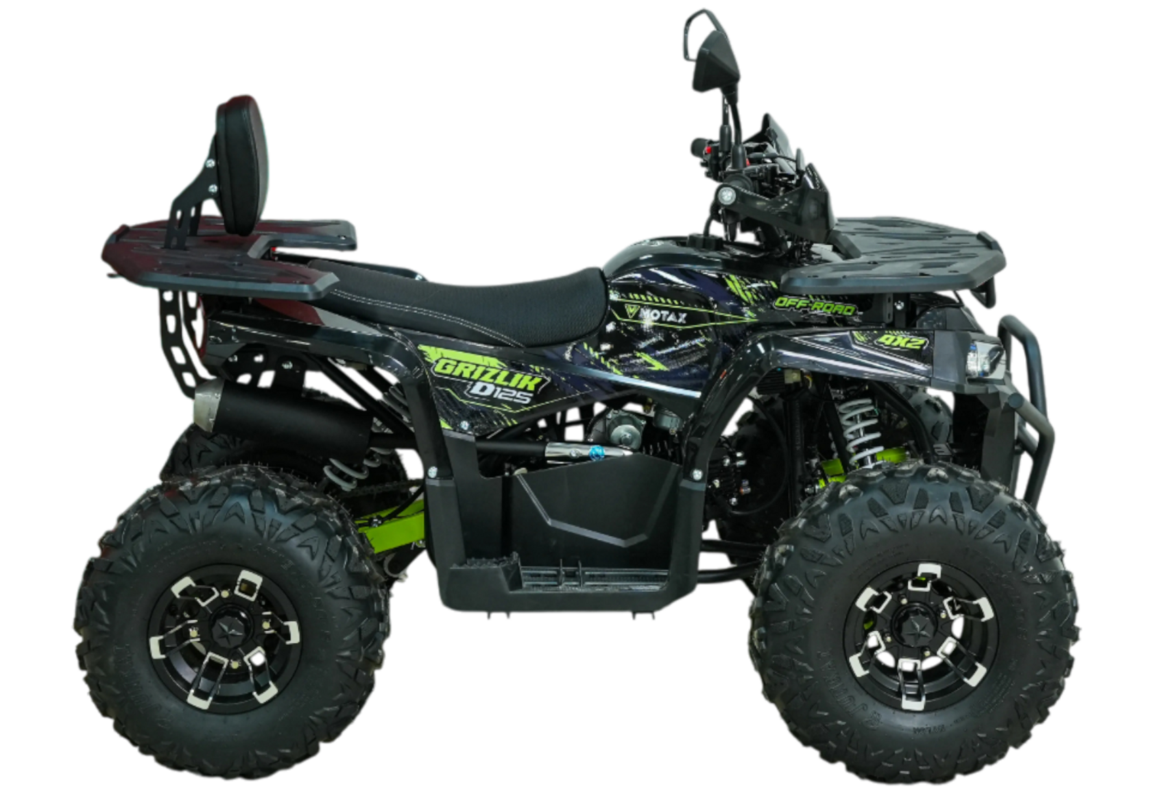 Квадроцикл бензиновый MOTAX GRIZLIK D125 LUX. Оборудован четырехтактным бензиновым двигателем, 125 кубов, мощностью 10 л.с. Развивает скорость до 55 км\ч. Допустимая нагрузка 100 кг.