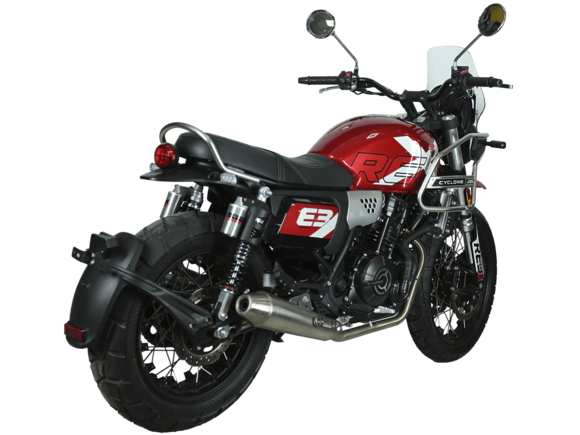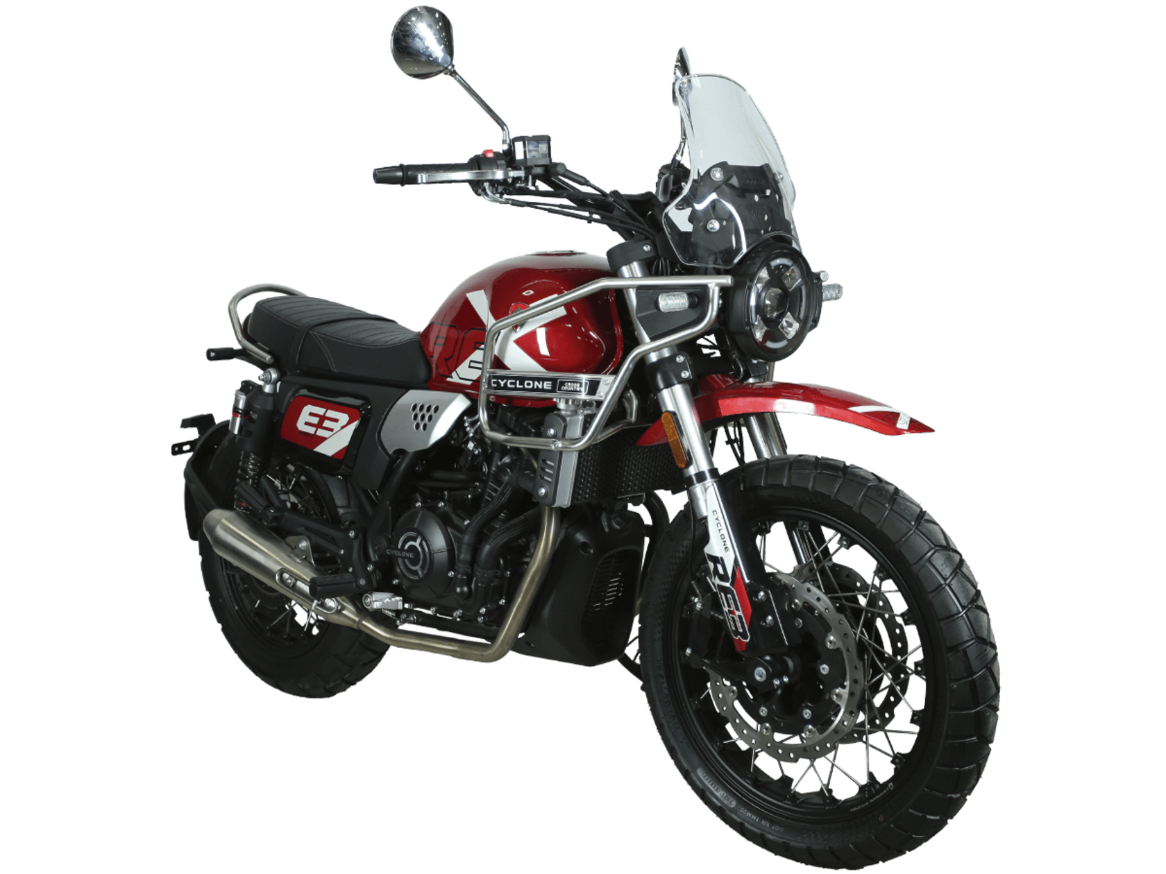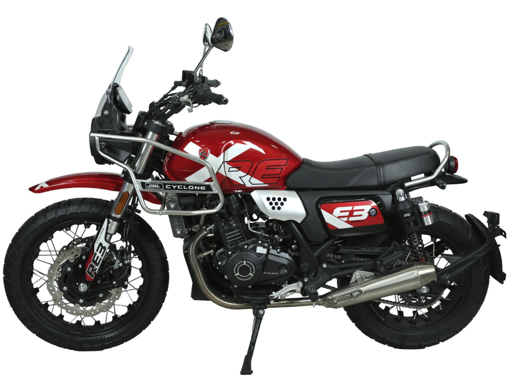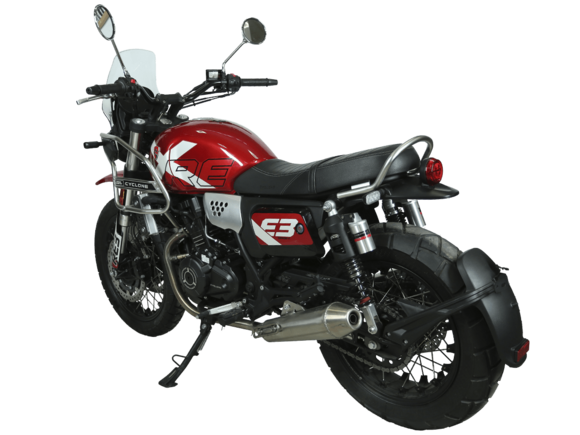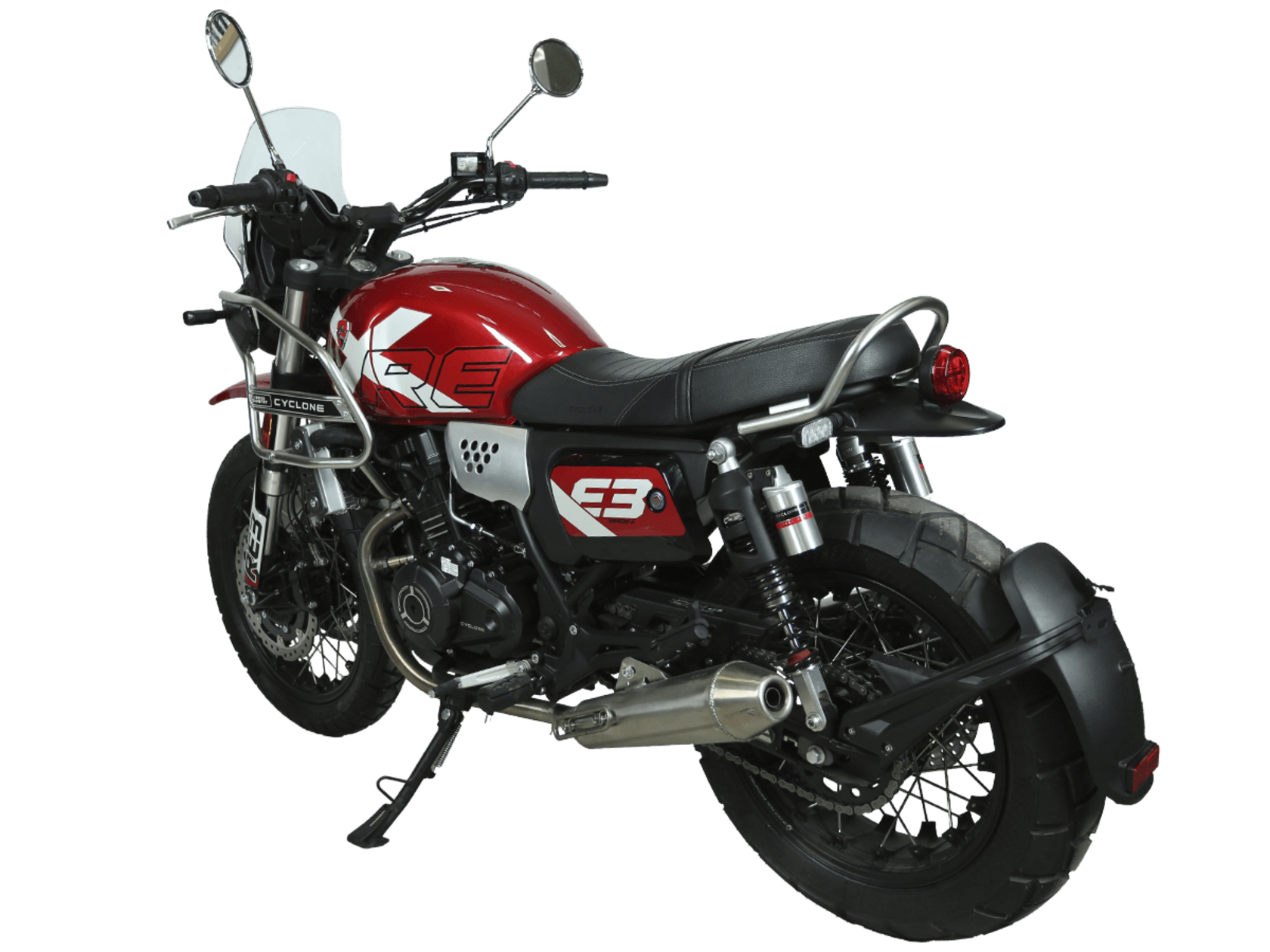 CYCLONE RE3 Scrambler (SR400-A) – универсальный мотоцикл, объединяющий в себе черты городского мотоцикла и эндуро. Управляя им, можно бросить вызов и городским пробкам, и скоростным автострадам, и всевозможному лёгкому бездорожью. Его дизайн отдаёт дань уважения каферейсерской тематике.Двухцилиндровый четырёхтактный двигатель объёмом 401 см3 выдаёт 43 л.с. на 9500 об/мин. Инжекторный впрыск топлива с инжектором BOSCH увеличивает топливную экономичность, а также позволяет добиться высокой приёмистости и неприхотливости агрегата. Жидкостная система охлаждения не допустит перегрева двигателя даже при самом агрессивном вождении. На мотоцикл установлена 6-ступенчатая механическая коробка передач.Максимальная скорость мотоцикла составляет 140 км/ч.Мотоцикл оснащён классическими спицованными колёсами диаметром 17 и 19 дюймов и имеет достаточно большой дорожный просвет – 22 см. С неровностями дороги эффективно справляются телескопическая вилка перевёрнутого типа спереди и маятник с двумя амортизаторами сзади. Ход передней подвески составляет 130 мм, задней – 81 мм. Оба компонента подвески являются регулируемыми. Эффективное и безопасное замедление с любых скоростей обеспечивают гидравлические дисковые тормоза с ABS спереди и сзади.Клиренс мотоцикла составляет 220 мм. Объём топливного бака – 19 л. Снаряжённая масса – 200 кг.На данной модели штатно установлены дуги безопасности, а также имеется бортовой компьютер с цветным дисплеем, USB-порт и подсветка пультов.RE3 Scrambler сочетает в себе отличные технические характеристики, комфорт и надёжность, что позволяет вам ощутить настоящую свободу на любой дороге с любым покрытием.