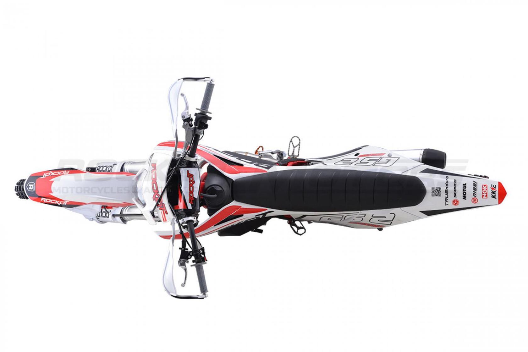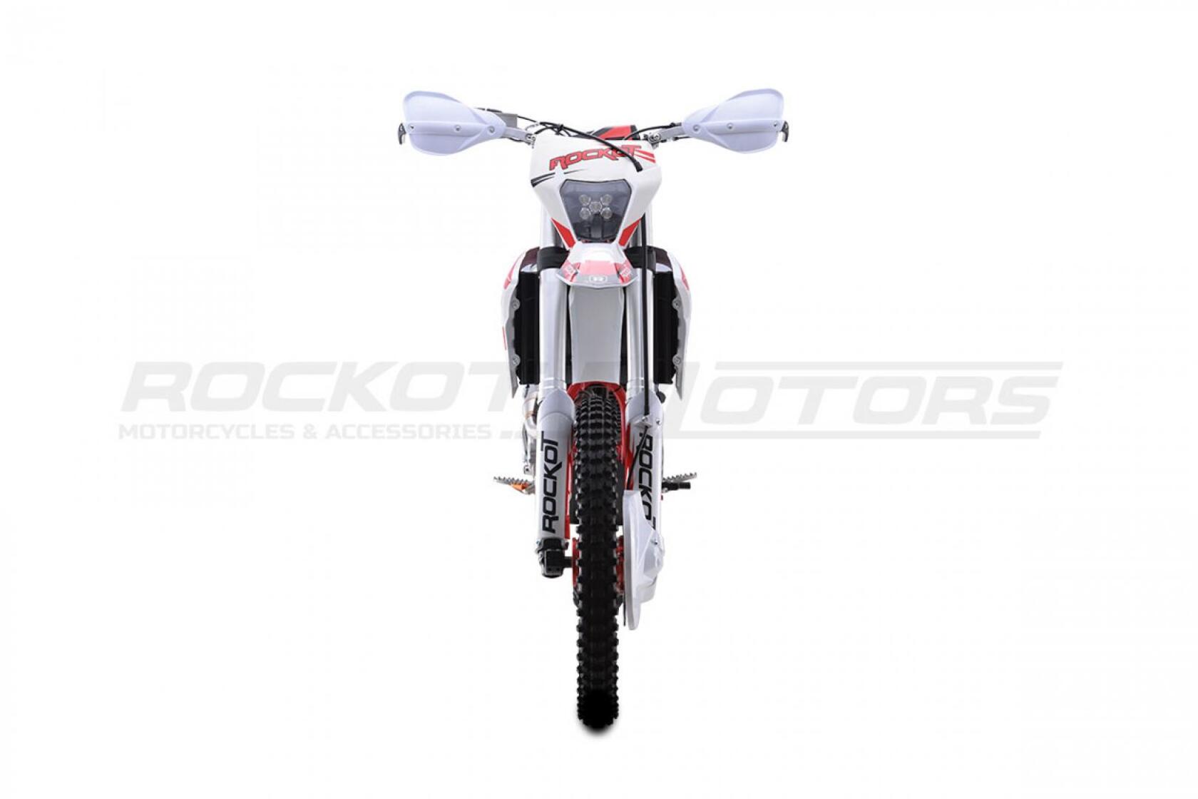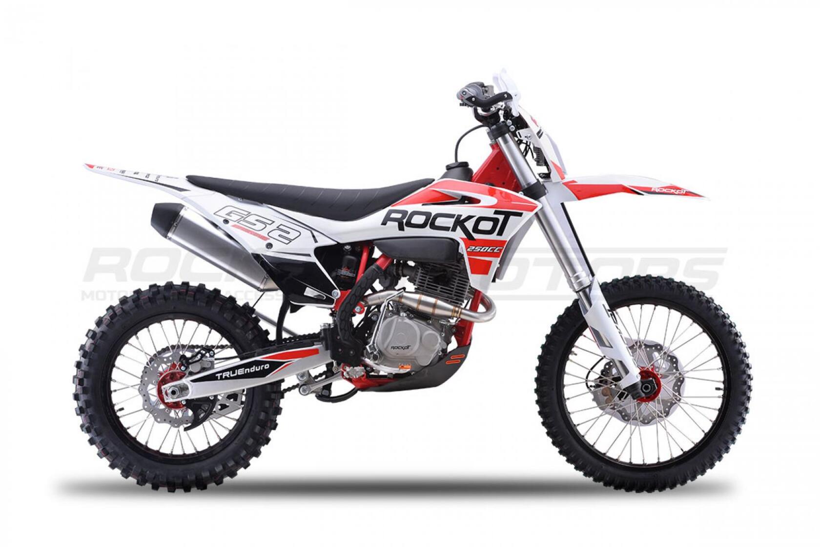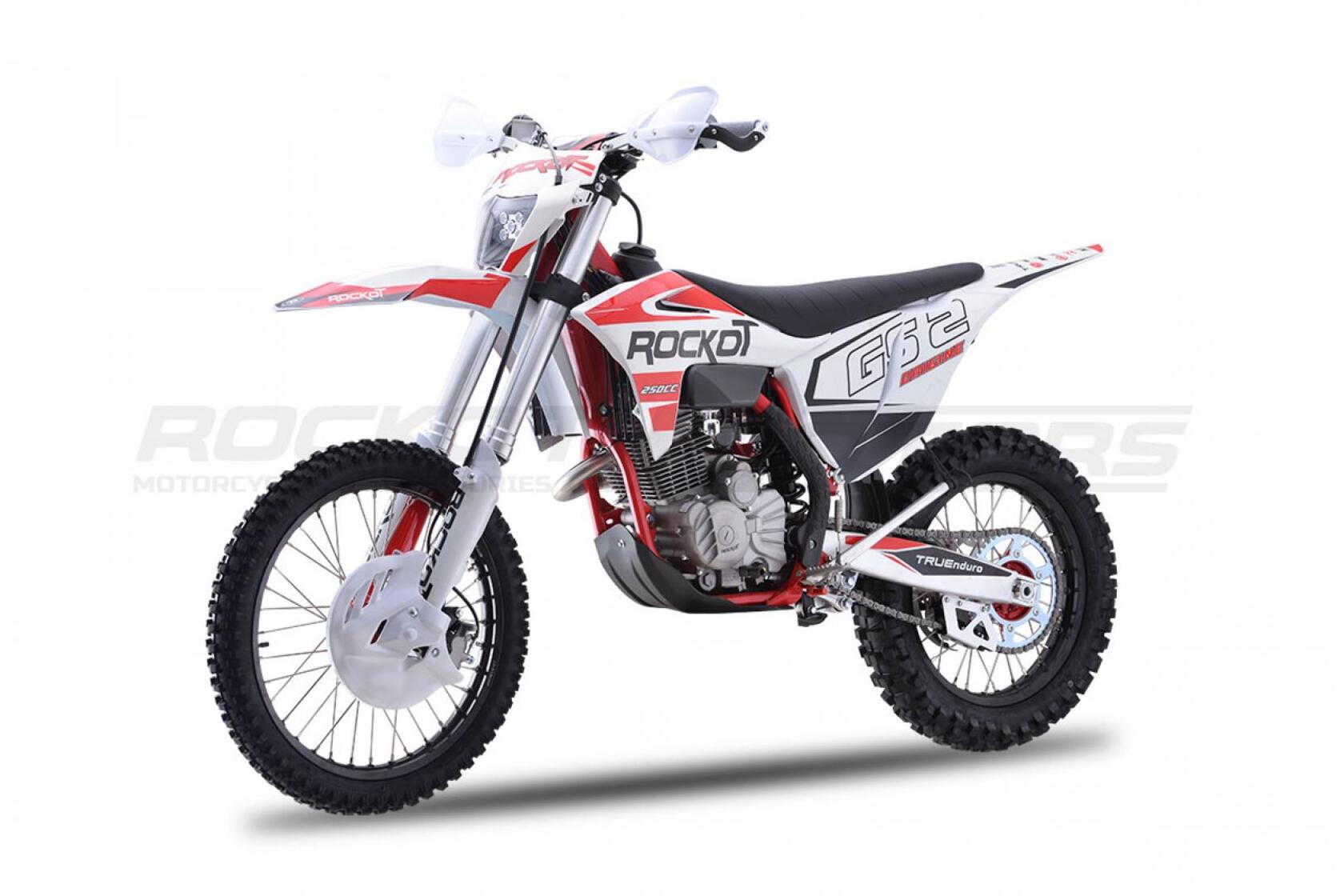 Вторая, обновленная версия эндуро мотоцикла ROCKOT GS 2 Origine.GS 2 Origine - полноразмерный эндуро мотоцикл, удовлетворяющий вкусу и потребностям как новичков, так и опытных райдеров.Мотоциклы ROCKOT серии GS, обрели высокую популярность, благодаря применению в плане дизайнерского и практического решения - пластика модели GASGAS.На белый пластик, нанесена графика в белой, красной, черной расцветке. Выбранное цветовое решение, придает мотоциклу броский, стильный дизайн, так характерный для внедорожной техники. Каждая деталь мотоцикла, дополняет общую концепцию дизайна.Обода колесных дисков окрашены в черный цвет, а красная графика нанесенная в виде наклеек, защитит ЛКП ободов от царапин. Алюминиевые ступицы окрашены в яркий, красный цвет.На черной раме установлена защита красно-черного цвета. Также, в красном цвете представлены: CNC крышка топливного бака и обслуживаемый топливный фильтр. Защита рук, складные, алюминиевые рычаги и траверсы окрашены в черный цвет.Предыдущая версия эндуро мотоцикла ROCKOT GS 2 Origine оснащалась двигателем CB250-F 172FMM-3A. Обновленный GS 2, обрел новый двигатель PR250 172FMM-5, с балансирным валом и пятиступенчатой КПП.Балансирный вал, значительно снижает уровень вибрации от двигателя, что ранее было единственным минусом двигателя CB250-F. Особенностью двигателя, можно считать то, что мощность двигателя осталась прежней - 21 лошадиная сила.За образование топливной смеси и ее подачу в двигатель, отвечает производительный карбюратор PE30. Повышает характеристики мощности и крутящего момента - обновленный “PowerBomb” увеличенного объема. Коробка передач - пятиступенчатая, с многодисковым сцеплением.ROCKOT GS 2 Origine построен на новой раме S8, которая является улучшенной, доработанной версией популярной рамы K8, аналогичной по геометрии рамам “австрийской троицы”. Рама производится из труб шестигранного сечения хром-молибденовой стали, которая является очень прочной и легкой. Подрамник производится из алюминия. Геометрия рамы, благодаря правильно выверенному центру тяжести и углу наклона вилки - способствует наилучшей управляемости устойчивости мотоцикла на низкой скорости.Устанавливаемая на мотоцикл ROCKOT GS 2 Origine подвеска известной фирмы “KKE” - делает мотоцикл одним из наиболее подходящих для проезда по сложным эндуро маршрутам. Спереди расположена телескопическая вилка перевернутого типа, длиной - 940 мм и толщиной рабочего штока - 48 мм. Конструкция вилки - регулируемая с картриджем открытого типа. Данная конструкция подвески отлично проявляет себя в эндуро, в том числе и в режиме гонки.Сзади установлен усиленный маятник из алюминия, который соединен с задним моноамортизатором, посредством системы рычагов прогрессии. Моноамортизатор “KKE” длиной 470 мм, регулируется на скорость сжатия, скорость отбоя и преднатяжение пружины. Широкий диапазон регулировки передней и задней подвески, позволит точно настроить ее работу под вес и стиль езды каждого райдера. Система прогрессии, обеспечивает равномерную, мягкую работу и увеличивает длину рабочего хода подвески..