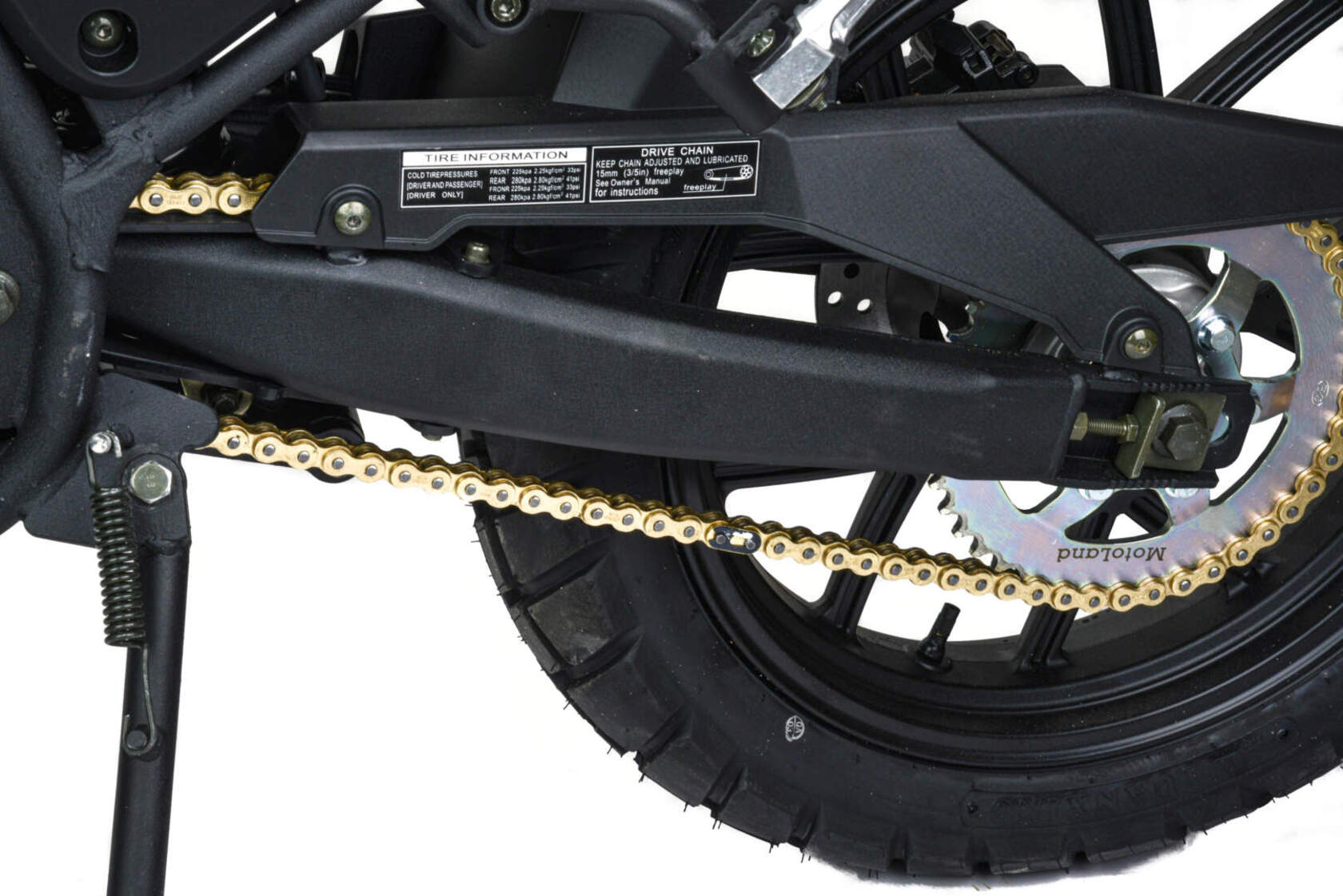 Motoland GS ENDURO является классическим турэндуро с укороченной колесной базой в размере 1330 мм. Он обладает вертикальным углом наклона вилки около 70 градусов и прямой посадкой, что делает его идеальным выбором как для начинающих райдеров, так и для опытных мото путешественников. Особенностью такой геометрии является легкость управления на низких скоростях. В сочетании с мощным двигателем ZS 172FMM-5 (PR250 с балансировкой), выдающим 21 лошадиную силу, мы получаем комфортный мотоцикл для городской езды и путешествий как по асфальту, так и по пересеченной местности.Мотоцикл Motoland GS ENDURO характеризуется своим ярким и узнаваемым дизайном, прочной рамой из Cro-mo труб, обладающей высокими прочностными характеристиками, а также современной подвеской с выносными регулировками компрессии и отскока. Он оснащен ободами из алюминиевого сплава, наличием электростартера, прямоточным выхлопом и LED оптикой с возможностью переключения между ближним и дальним светом. Двигатель ZS 172FMM-5 с балансирующим валом обеспечивает интуитивно понятную отдачу мощности и работает на воздушном охлаждении. Cro-mo рама обладает высокой прочностью, долговечностью и ремонтопригодностью.LED фара с двумя режимами работы обеспечивает яркое освещение в темное время суток, а влагозащищенная приборная панель обеспечивает надежность и защиту электроники.Литые алюминиевые колеса с размерами 2.5x17 110/80 - 3.5x17 130/80 значительно снижают неподрессоренную массу мотоцикла, обеспечивая великолепную работу подвески даже на неровных дорогах и комфортную поездку для райдера.Удобное мягкое сиденье, ветровое тонированное стекло, USB-зарядка и жидкокристаллическая цветная приборная панель с подсветкой - заставят радоваться комфорту и удобству.Мощные гидравлические 4-поршневые дисковые тормоза, а также резина, обеспечивают отличное качество разгона, торможения и устойчивость в поворотах как на асфальте, так и на сухих грунтовых дорогах. Они также обладают высокой износоустойчивостью.Защита картера двигателя и стальные звезды увеличивают надежность и срок службы мотоцикла. Багажник на заднем крыле и подножки для пассажира позволяют удобно перевозить груз и предоставляют дополнительные возможности для пассажира.