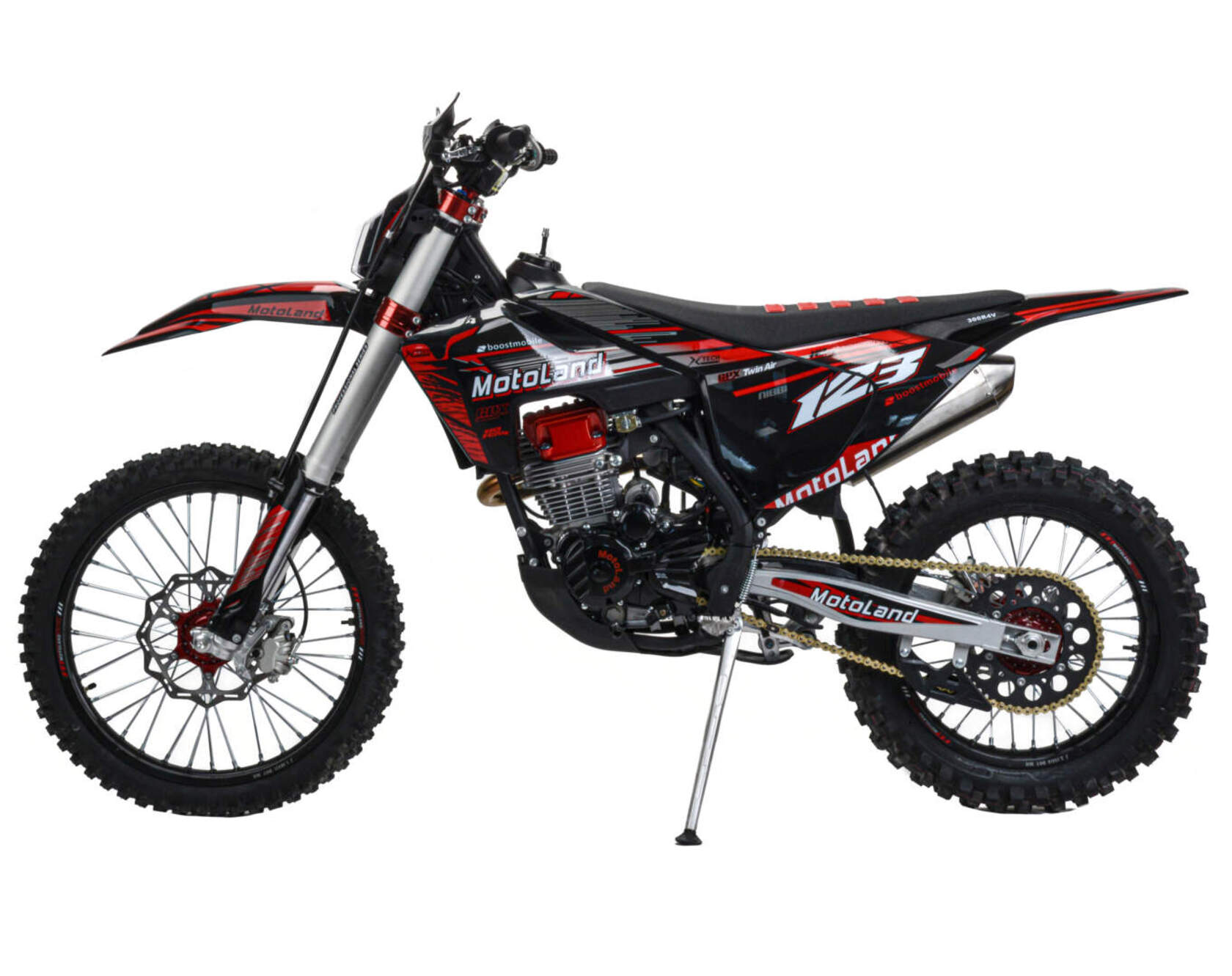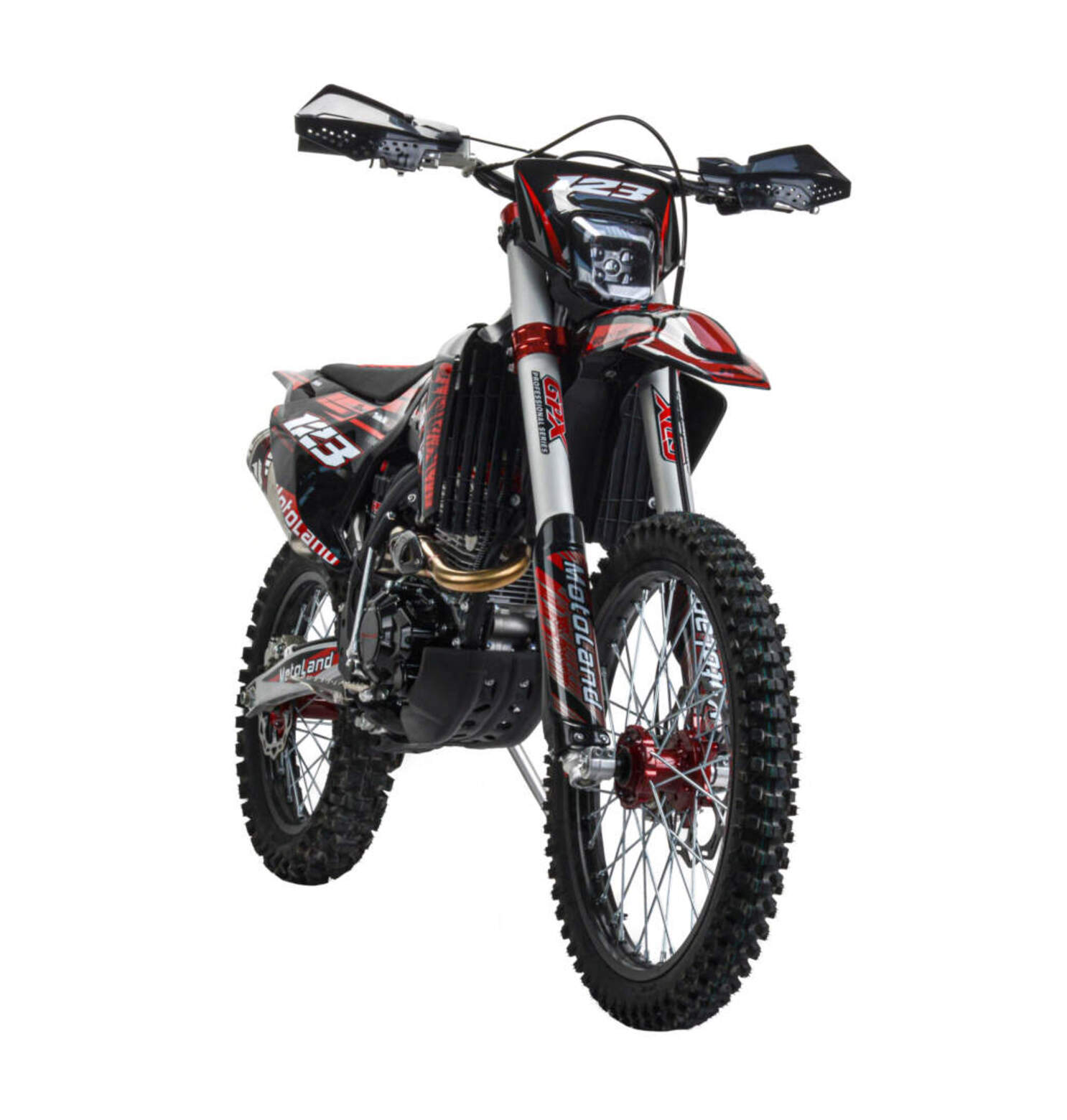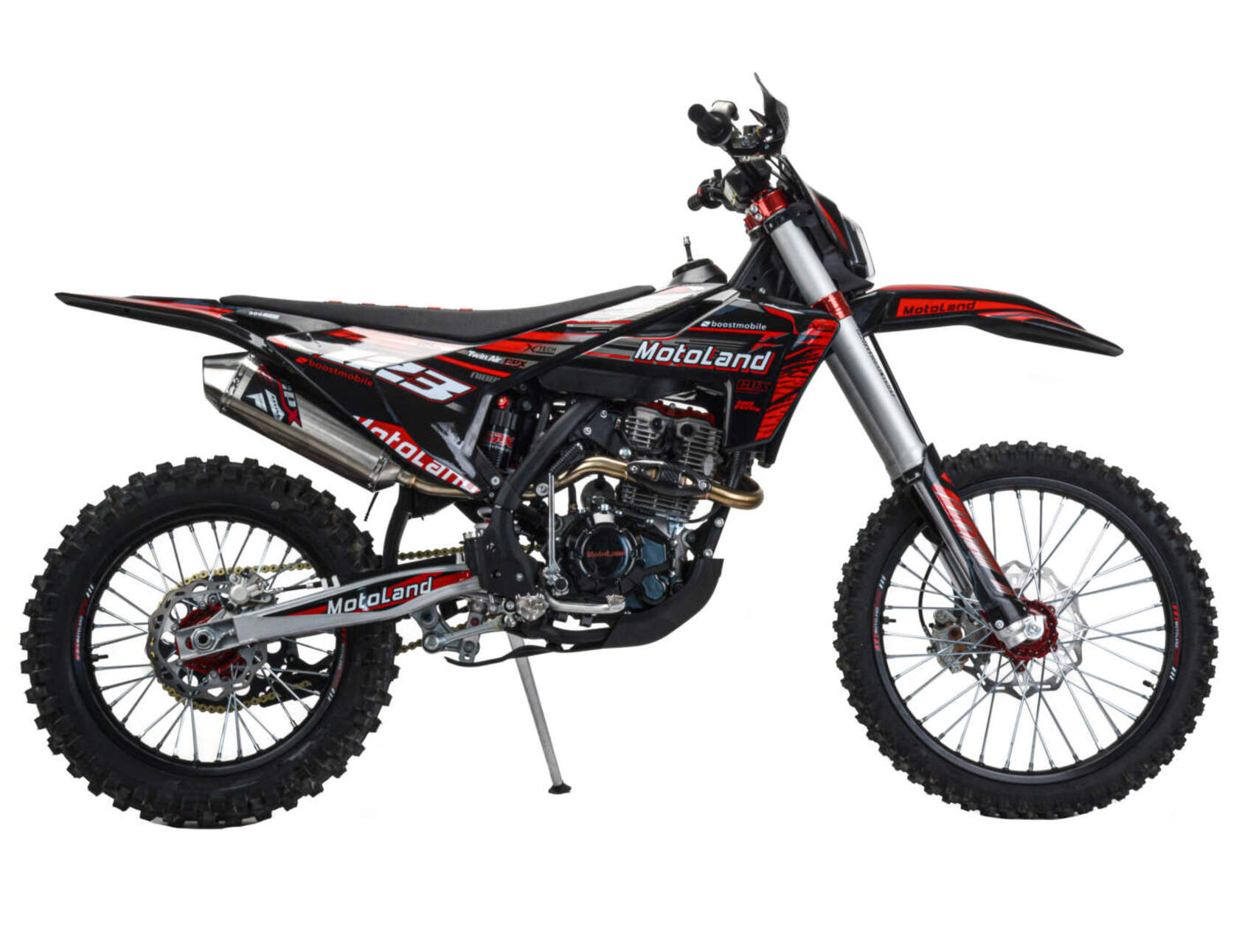 Мотоцикл Motoland XT300 STНадёжная техника оснащенная двигателем 175FMM (PR5 4 клапана) с водяным охлаждением. с кикстартером и электростартером, Мощностью 26 Л.С. на двигателе установлен Карбюратор NIBBI n34 с ускорительным насосом.Это полноразмерный кроссовый мотоцикл его база по осям составляет 1400 мм., и габаритами 2100х800х1120 мм. Высота по седлу составляет 950 мм. Передние и задний амортизаторы с регулировками.За счет сбалансированной базы мотоцикл имеет отличную управляемость, а конструкция рамы и особенности настройки подвески GPX способствуют максимальному поглощению неровностей дорожного покрытия, а так же усиленная прогрессия на игольчатых подшипниках. Алюминиевые обода c антибуксаторами, усиленными спицами и ступицами.На кроссовой резине 80/100-21 / 110/100-18На мотоцикле установлена обновлённая тормозная система обеспечивающая отличные тормозные характеристики. Глушитель с уникальным дизайном прямоточного типа, полностью алюминиевый для облегчения веса.
