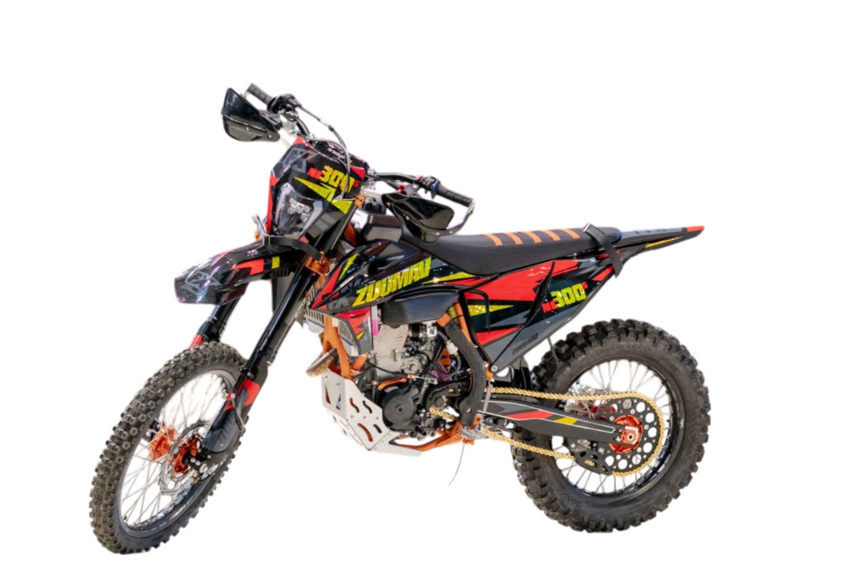 Модель ZUUMAV К8 NС300. Хром-Молибденовая рама повышенной прочности,Алюминиевый маятник,Двигатель Zongshen 4Т,177MМ-5, заявленная мощность 36 л.с. Коробка 6-МКПП,водяное охлаждение с вентилятором (PANASONIC), защита радиаторов, легкий выжим сцепления AJ1,электро и кикстартер, Трехпозиционный ключ зажигания,Цифровой дисплей + счетчик моточасов,Алюминиевый руль 28/22 сплав 7075, Короткоходная ручка газа СNC,Армированная защита рук,Складные рычаги тормоза и сцепления IGP CNC ,Обода Алюминий 7116 , Ступицы анодированные CNC,Спицы из нержавеющей стали 4 мм, траверсы CNC, передняя вилка полностью регулируемая KKE 54*60- 940мм шток 48мм, задний амортизатор полностью регулируемый ККЕ с Алминиевой прогрессией, антискользящие сиденье. Белый увеличенный топливный бак емкостью 10 литров. Карбюратор NIBBI RACING PWK34 Black. Звезды перед/зад 13/52. Цепь SFR 520. Шины перед/зад 80х100-21, 110х100-18 KENDA off-road. Выхлопная система с резонатором из нержавеющей стали. Глушитель копия FMF. Буксаторы AJ1 облегченные композитные. Диодная фара с ходовыми огнями, щиток номера. Комплект жиклеров карбюратора, алюминиевая защита двигателя. Защита рамы, подшипники Тайвань.