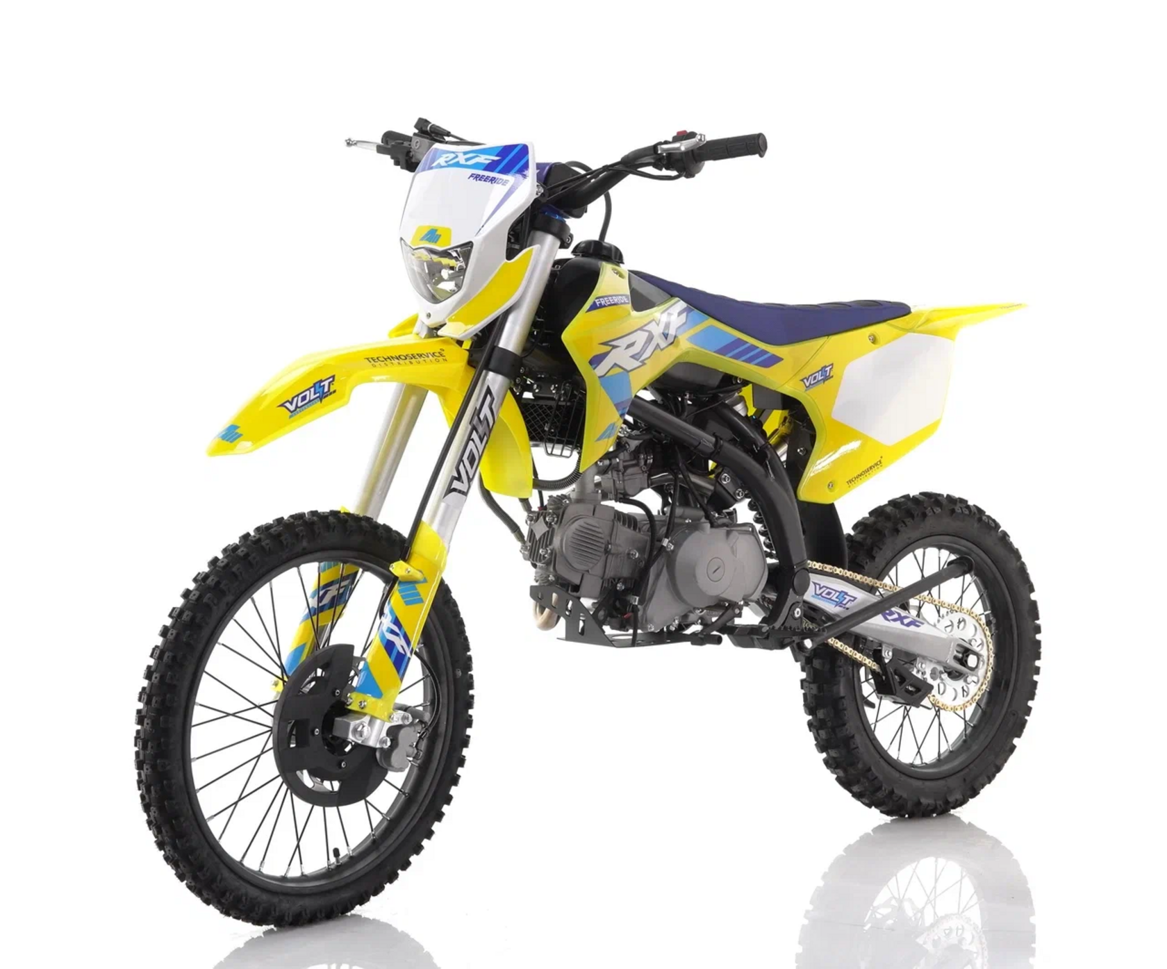 Кроссовый мотоцикл APOLLO RXF Freeride 125 LE отличается продуманностью и надежностью конструкции, о чем говорит и название французского бренда, и масса положительных отзывов пользователей.Хребтовая V-образная рама обновленного РХФ спроектирована специально под большие колеса, между которыми помещается топливный бак на 6,5 литра. Передвигаться по бездорожью стало удобней и из-за увеличенных задних и передних крыльев – грязь не разбрызгивается и не попадает на райдера. Езда в стойке особенно комфортна благодаря увеличенному расстоянию между седлом и подножками. Передняя подвеска – ставшая уже классической VOLT V-ONE на 830 мм, задняя – регулируемая VOLT V-Force на 350 мм.Одноцилиндровый четырехтактный двигатель YX с объемом 125-кубов закрыт от попадания в него посторонних предметов стальной защитой VOLT. На этот мотор установлен карбюратор Molkt PZ26. Классическая механическая четырехступенчатая коробка передач с нейтральной передачей в самом низу стала самым удобным решением.Электростартер очень полезен, когда двигатель заглох в сложных условиях (например, при въезде на гору, пересечении болота), запустить его можно просто нажав кнопку. Предусмотрена фара на случай езды в темное время суток, который можно заменить на щиток с номером, идущим в комплекте. На руле установлены фирменные грипсы Apollo.