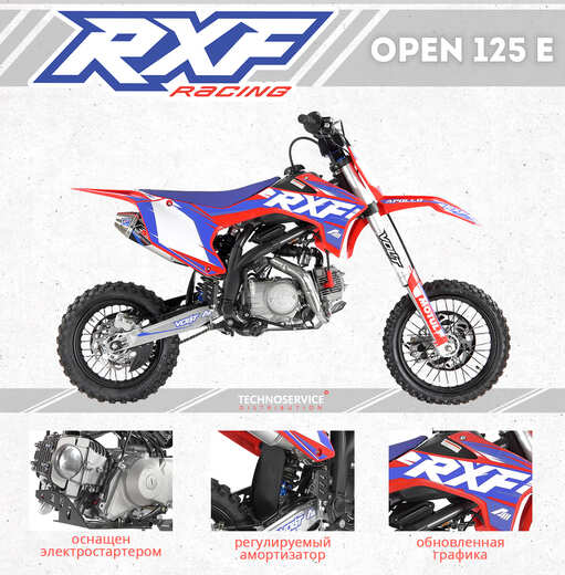 Представляем Вам обновленный RXF Open 125 E 14/12. Модель получила новую графику, задний амортизатор с регулировкой и двигатель с электростартером.Питбайк занимает промежуточную ступень между моделями Junior и Freeride и отлично подойдет как подросткам так и настоящим фанатам, признающим питбайки только на колесах 14/12.Двигатель с электростартером сможет запустить даже ребенок, а регулируемый задний амортизатор позволит настроить подвеску под ваш стиль катания.