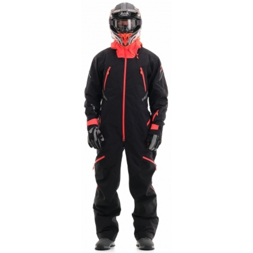 Комбинезон предназначен для снегохода и сноубайка. Надежно защитит от ледяного ветра и мокрого снега. Ткань верха дополнительно содержит тефлоновое водоотталкивающее покрытие. Внешние молнии влагозащитные. Проклеены все швы. На рукавах есть эластичные манжеты, на штанинах снегозащитные юбки с петлёй для фиксации к ботинкам. При закрытой вентиляции и карманах комбинезон герметичен.Функционал комбинезона тщательно продуман и зарекомендовал себя среди снегоходчиков и сноубайкеров. Светоотражающие элементы есть со всех сторон. Семь карманов покрывают все потребности райдера, в том числе для ски-паса, телефона, и теплые, для согревания рук. Есть удобная петля под тангенту рации и кольцо D-ring для ключа горного снегохода. Центральная молнии с тремя замками: открывается сверху и снизу. Несъемный капюшон с двойной утяжкой. Для удобства приема пищи и воды во время стоянки – есть расширения на воротнике, защищает от ветра в расстёгнутом виде. В помещении можно снять верхнюю часть комбинезона и воспользоваться регулируемыми лямками - подтяжками.
