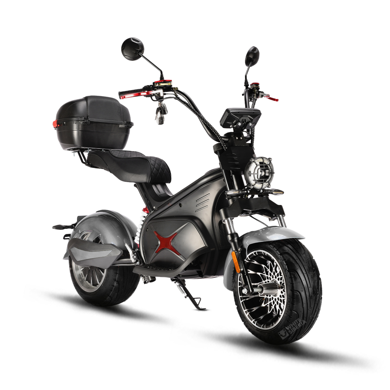 Электроскутер White Siberia Black Sea 5000W – эксклюзивная новинка от White Siberia. Компанией представлен совершенно новый взгляд на форм-фактор CityCoco и его дизайн. Брутальный и харизматичный скутер смотрится ярко и броско: каждая его деталь оригинальна. Модель полностью адаптирована к российским условиям и дорогам.Конструктивно электроскутер White Siberia Black Sea 5000W не имеет аналогов среди похожих моделей. У него оригинальная рама и большое мотоциклетное седло. Сиденье очень комфортное и рассчитано на перевозку водителя и пассажира. Позади седла – площадка для крепления бокса или кофра. В базовой комплектации скутер поставляется с кофром, который подходит для транспортировки личных вещей и одновременно служит спинкой для пассажира.Электроскутер плавно движется по городскому асфальту и легкому бездорожью за счет качественных амортизаторов спереди сзади. Двойная настраиваемая подвеска мотоциклетного типа эффективно сглаживает дорожные неровности. Широкие покрышки с оригинальными колесными дисками не только придают скутеру эффектный вид, но и обеспечивают устойчивость во время движения. White Siberia Black Sea 5000W имеет высокий руль чоппер, на который введен все необходимые элементы управления. Транспорт укомплектован большим информативным бортовым компьютером, полным комплектом светодиодной оптики, зеркалами заднего вида, надежными дисковыми гидравлическими тормозами, стояночной подножкой.