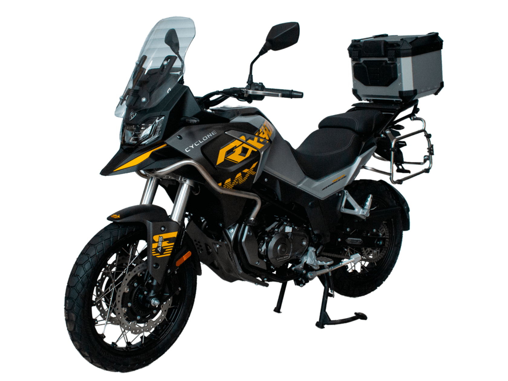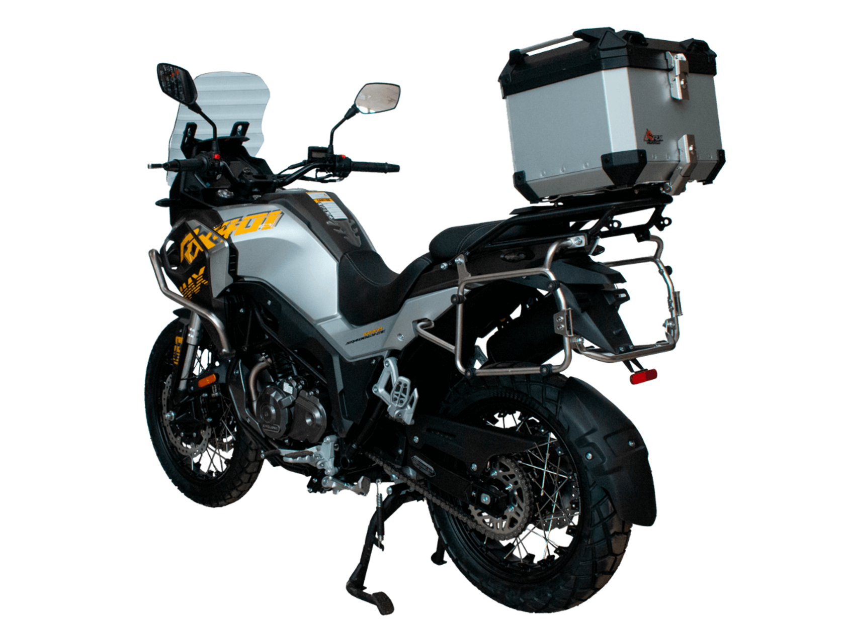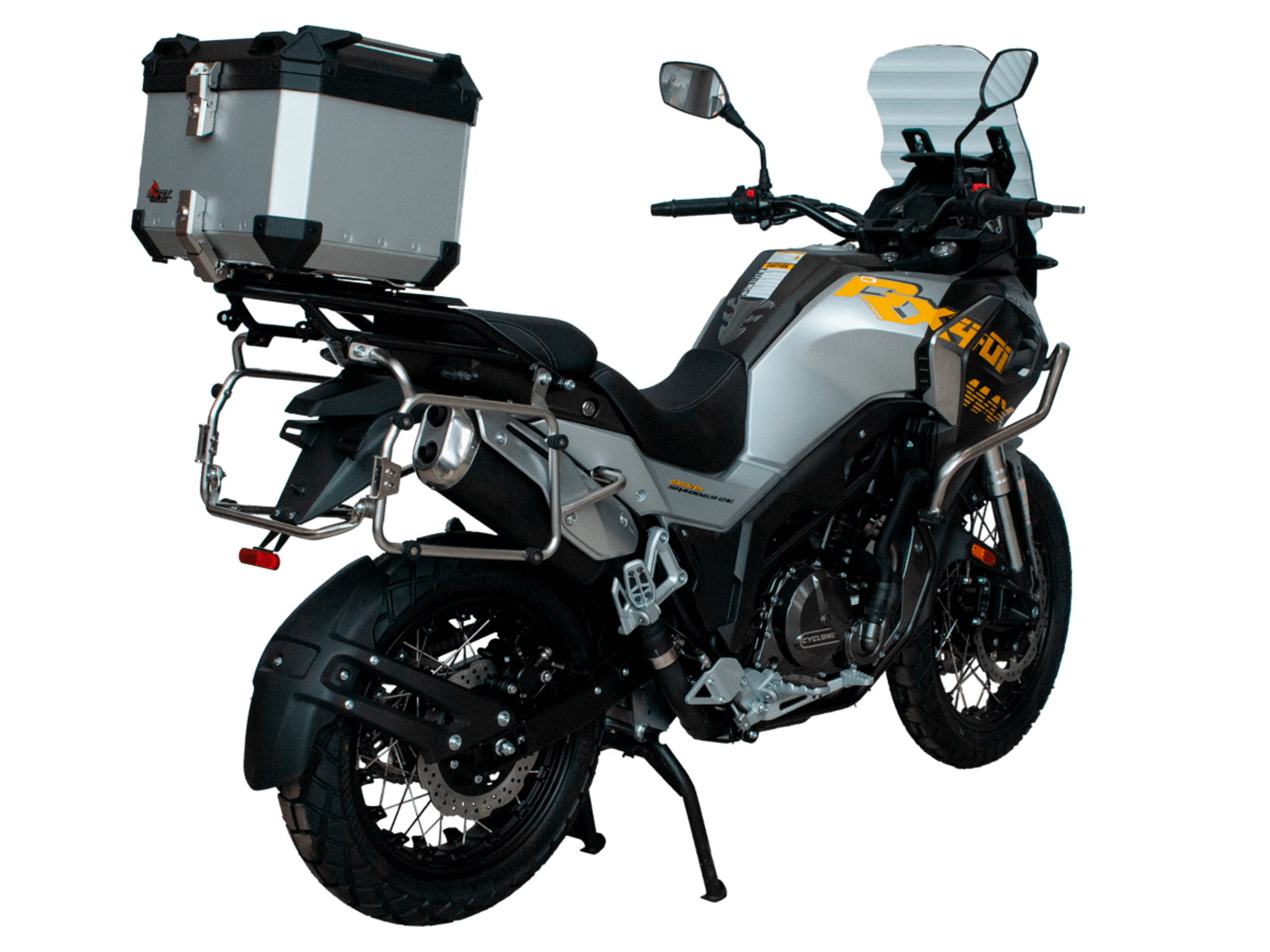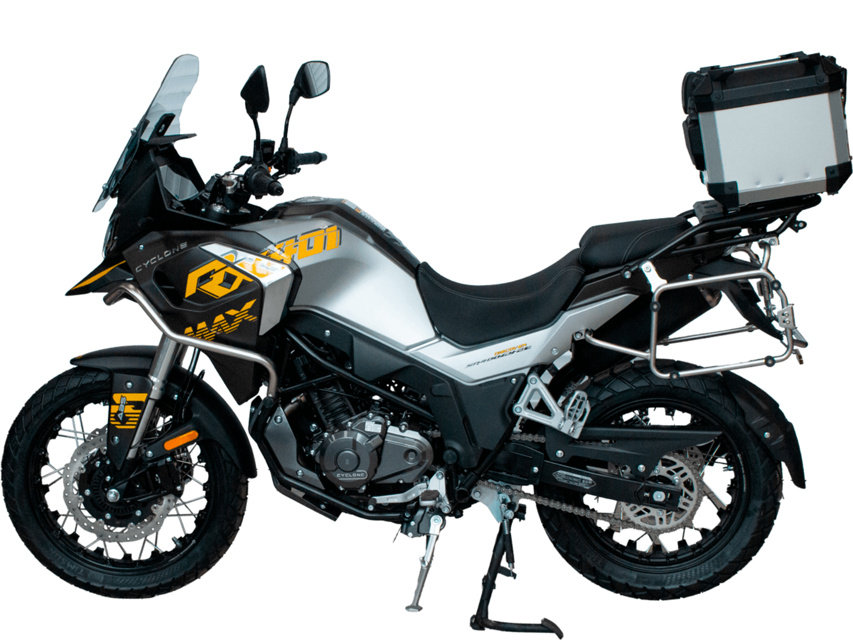 Мотоцикл CYCLONE RX401 (SR400GY-2D) – туристический эндуро, готовый бросить вызов любым дорогам и расстояниям. За рулём этого мотоцикла для вас не будет невозможных маршрутов. Его агрессивный дизайн всецело соответствует традициям жанра данного класса мототехники.Рядный двухцилиндровый четырёхтактный двигатель объёмом 401 см3 выдаёт 43 л.с. на 9500 об/мин. Максимальный крутящий момент достигается на 8000 об/мин и составляет 37 Н·м. Инжекторный впрыск топлива с блоком управления BOSCH увеличивает топливную экономичность, а также позволяет добиться высокой приёмистости и неприхотливости агрегата. Жидкостная система охлаждения не допустит перегрева двигателя даже при самом агрессивном вождении. На мотоцикл 6-ступенчатая механическая коробка передач.Максимальная скорость мотоцикла составляет 139 км/ч.RX401 оснащён спицованными алюминиевыми колёсами диаметром 17 и 19 дюймов. Колёса обуты в бескамерные покрышки от фирмы CST. С неровностями дороги эффективно справляются телескопическая вилка перевёрнутого типа спереди и маятник с моноамортизатором сзади. Ход передней подвески составляет 130 мм, задней – 55 мм. Оба компонента подвески являются регулируемыми. Эффективное и безопасное замедление с любых скоростей обеспечивают гидравлические дисковые тормоза с двухканальной системой ABS спереди и сзади.Клиренс мотоцикла составляет 185 мм. Объём топливного бака – 20 л. Снаряжённая масса – 215 кг.Мотоцикл отличает хорошо продуманная компоновка с высоко расположенным радиатором. На данной модели штатно установлены дуги безопасности, защита картера и двигателя, а также багажник с креплениями для боковых кофров. Кроме того, мотоцикл снабжён центральной подножкой для лёгкого обслуживания цепи, колес и вилки.Бортовой компьютер оборудован цветным дисплеем привлекательного дизайна со специальным защитным козырьком, спасающим от брызг и бликов. Из других приятных мелочей в допоборудовании мотоцикла стоит выделить 12-вольтовую розетку, подсветку пультов и USB-порт.Мотоцикл сочетает в себе отличные технические характеристики, комфорт и надёжность, что позволяет вам ощутить настоящую свободу на любой дороге с любым покрытием.