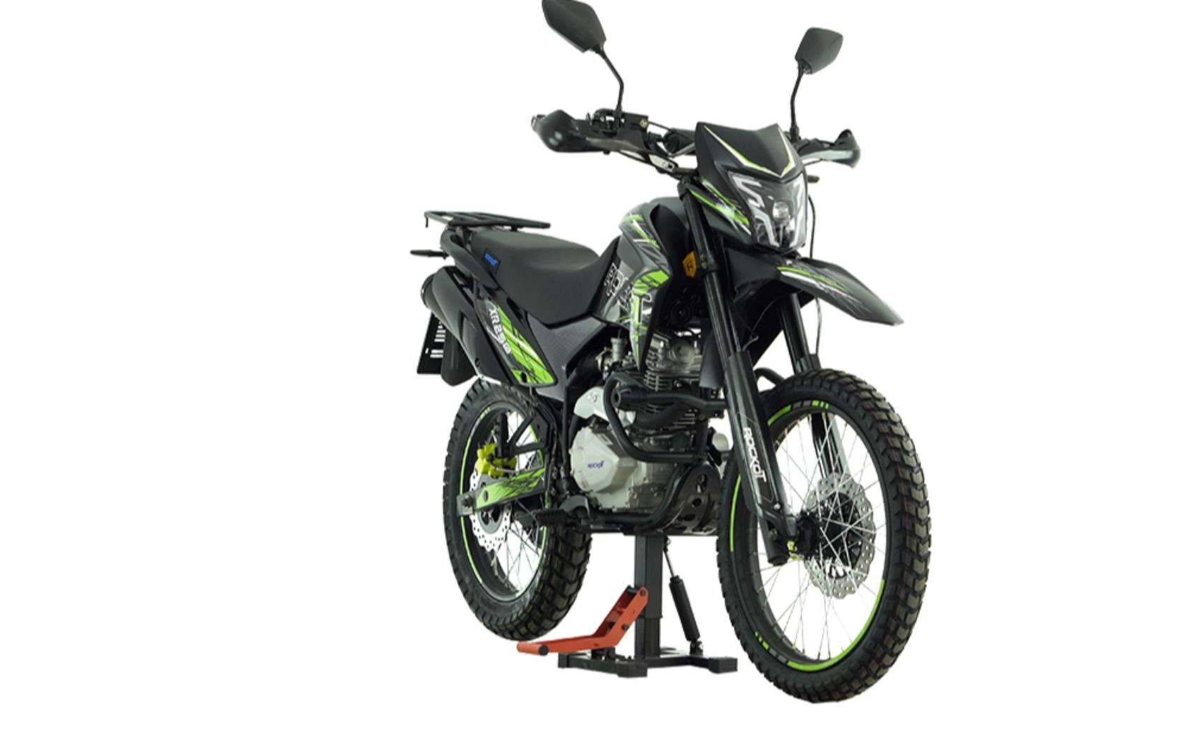 ROCKOT XR250 - новинка 2024 года в классе софт-эндуро. Мотоцикл имеет электронный ПТС и способен проехать везде, где пожелает его райдер. Колесная база 1380 мм и высота по седлу 850 мм обеспечивают потрясающую управляемость как на городских улицах, так и на бездорожье. ROCKOT XR250 - это современный софт-эндуро мотоцикл в ярком уникальном дизайне. На выбор предоставляются мотоциклы в трех вариантах расцветки: оранжевой, зеленой и красной.Назначение мотоцикла прямо указывает на наличие колес размерностью 21/18, широкое мягкое сиденье, вместительный топливный бак из металла, прочный эластичный облицовочный пластик и задний багажник, на который можно установить центральный кофр. Обода колесных дисков и тормозные суппорты имеют наклейки и окраску в один цвет с графикой мотоцикла. На руле установлена алюминиевая защита рук и рычагов. Цифровая приборная панель обеспечит водителю своевременный доступ ко всем необходимым данным во время поездки. Фара в современном дизайне с LED лампой ярко освещает дорогу в темное время суток и обеспечивает заметность мотоцикла в потоке в светлое время суток. Эндуро мотоцикл ROCKOT XR250 оснащается мощным, надежным и популярным двигателем ZONGSHEN (с 2023 года ZONSEN) PR250 172FMM с балансирным валом, мощность которого в пике достигает 21 лошадиную силу. Данный двигатель давно полюбился многим райдерам благодаря его надежности, простоте в обслуживании, высоким динамическим характеристикам, позволяющим преодолевать крутые подъемы и сложные препятствия. Важным преимуществом двигателя является наличие балансирного вала, устраняющего вибрации, исходящие от двигателя. Балансирный вал делает управление мотоциклом еще более комфортным. За образование топливовоздушной смеси отвечает производительный карбюратор NIBBI Racing PE28, отличающийся качественной работой, быстрым откликом на ручку газа и простотой в регулировке благодаря легкому доступу к регулировочным винтам. В основе мотоцикла стоит прочная стальная рама с “правильной” эндуро геометрией, обеспечивающей наилучшую управляемость на бездорожье и маневренность в городском потоке. В комплектацию мотоцикла также входят защитные дуги безопасности с крашпедами, позволяющие защитить райдера и облицовочный пластик мотоцикла.. Передняя и задняя подвески эндуро мотоцикла ROCKOT XR250 обеспечат высокую проходимость на бездорожье и комфортную езду с пассажиром. Спереди установлена телескопическая вилка перевернутого типа из двух амортизаторов, длиной 830 мм и толщиной рабочего штока 37 мм. Задняя подвеска состоит из стального маятника, моноамортизатора, длиной 400 мм, и прогрессивных рычагов, делающих работу подвески сбалансированной и равномерной. Эндуро мотоцикл ROCKOT XR250 оснащается гидравлическими дисковыми тормозами спереди и сзади. Передний тормоз состоит из 270 мм тормозного диска и двухпоршневого суппорта, а сзади диск, диаметром 240 мм, и однопоршневой суппорт. Все тормозные шланги армированные. Стандартно для эндуро мотоцикла, ROCKOT XR250 оснащается стальными колесными дисками, диаметром 21 и 18 дюймов, и универсальными вседорожными шинами. Размерность шин: 90/100-21 и 120/90-18. Такие шины способны обеспечивать хорошее сцепление с дорогой на асфальтовом покрытии и с грунтом на бездорожье.Привод осуществляется приводной цепью, шагом 520. Ведомая приводная звезда имеет 45 зубьев.
