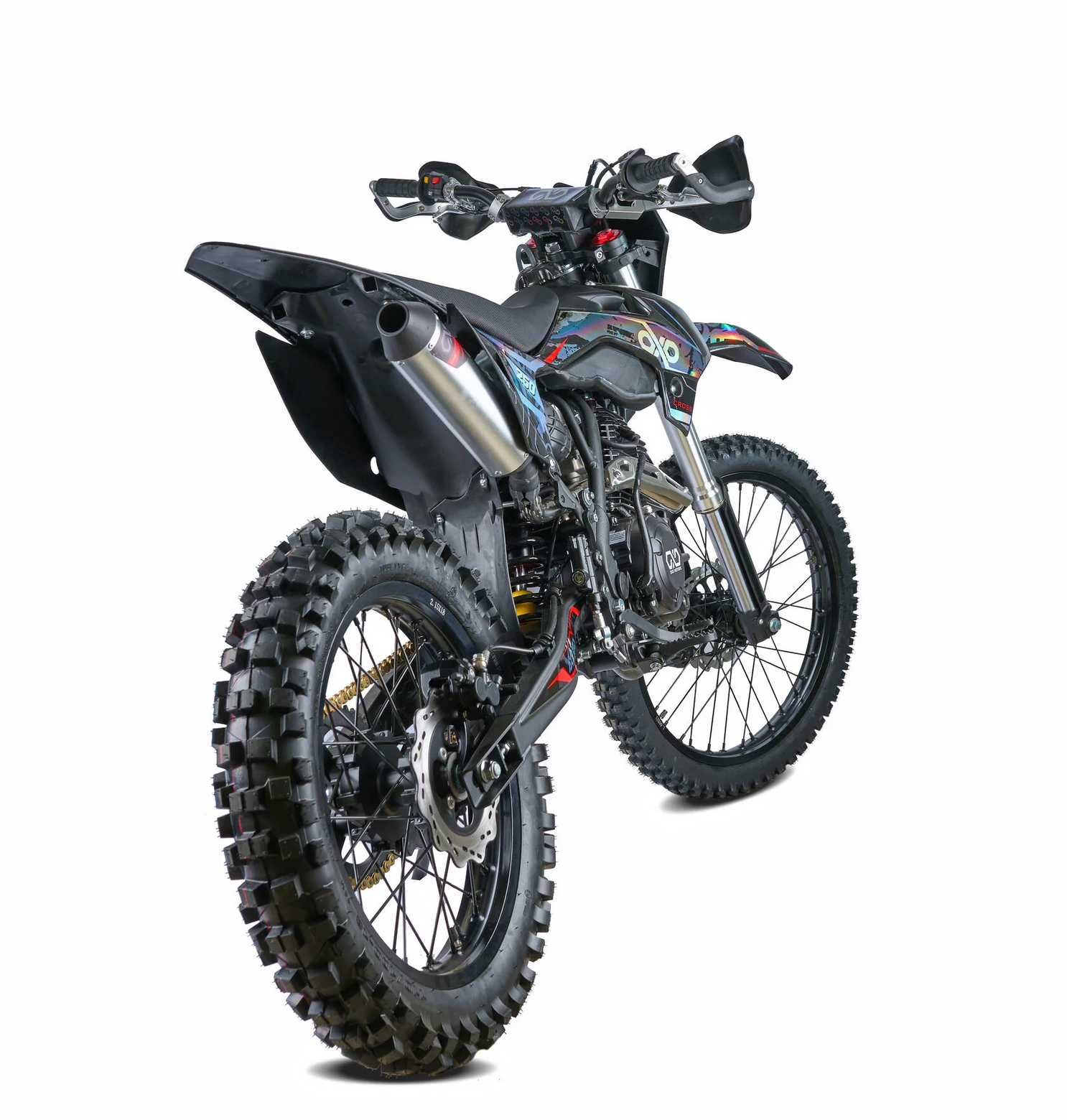 ДвигательМодель оснащена двигателем Zongshen 172FMM-3A с пятиступенчатой КПП. Особенностью двигателя, можно считать то, что данный двигатель является самым надежным среди серии моторов Zongshen.РамаРама мотоцикла OXO производится из труб шестигранного сечения хром-молибденовой стали, которая является очень прочной и легкой. Геометрия рамы, благодаря правильно выверенному центру тяжести и углу наклона вилки - способствует наилучшей управляемости устойчивости мотоцикла на низкой скорости.ПодвескаПередняя вилка перевернутого типа. Мотоцикл снабжен моноамортизатором, который соединен посредством системы рычагов прогрессии. Система прогрессии, обеспечивает равномерную, мягкую работу и увеличивает длину рабочего хода подвески.КолесаВ переднем и заднем колесах установлены антибуксаторы, которые притягивают покрышку к ободу, позволяя ездить по бездорожью при низком давлении в камерах, не давая покрышке проворачиваться во время езды. Размер передней покрышки: 80/100-21. Размер задней покрышки: 120/100-18. Они прекрасно себя ведут по песку и грязи, что позволяет райдеру отлично показать себя на пересеченной местности.Тормозная системаТормозная система мотоцикла - полностью гидравлическая с армированными шлангами. Спереди и сзади установлен двухпоршневой суппорт. Данная конфигурация тормозных механизмов, позволит быстро и безопасно остановиться с максимальной скорости даже на бездорожье.РульВажная часть современного эндуро мотоцикла - усиленный руль переменного сечения. На руле установлен рычаг заслонки подсоса. Алюминиевая ручка газа с коротким ходом имеет регулировку троса..